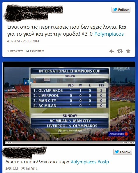 Η νίκη του Ολυμπιακού με 3-0 επί της Μίλαν προκάλεσε... έκπληξη σε Έλληνες και ξένους φιλάθλους, τουλάχιστον κρίνοντας από τα σχόλια του twitter κατά τη διάρκεια, αλλά και μετά τη λήξη του αγώνα.