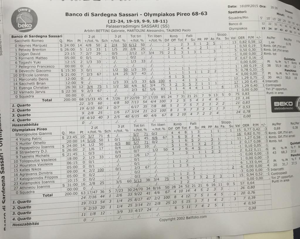 Ολυμπιακός (Σφαιρόπουλος): Γιανγκ 10 (8ριμπ, 1κοψ), ,Χάντερ 14 (9ριμπ), Παπαπέτρου 14 (4τριπ, 6ριμπ), Στρόμπερι 2 (6ριμπ), Τσαϊρέλης 1 (6ριμπ), Τολιόπουλος 2 (3ριμπ), Μουράτος, Αγραβάνης 4, Καλαμπόκης, Αθηναίου 16 (3τριπ), Καλογιαννίδης.