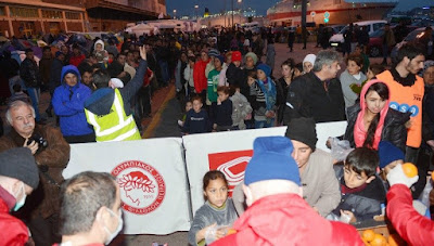 Και την Τρίτη οι άνθρωποι του Ολυμπιακού μοίρασαν χιλιάδες μερίδες φαγητού αλλά και ρούχα, παπούτσια και κουβέρτες στους πρόσφυγες που έχουν κατακλύσει το λιμάνι του Πειραιά.